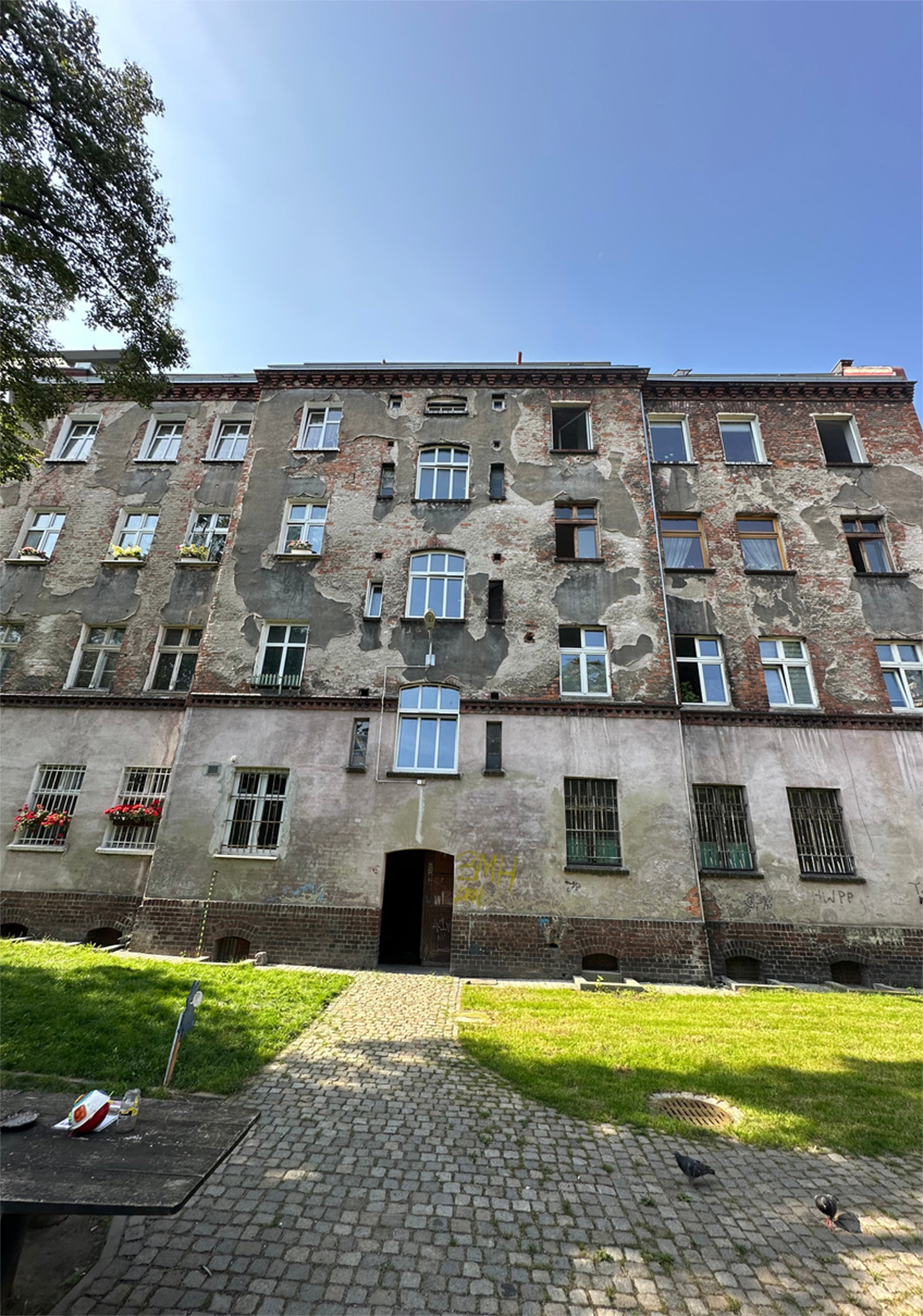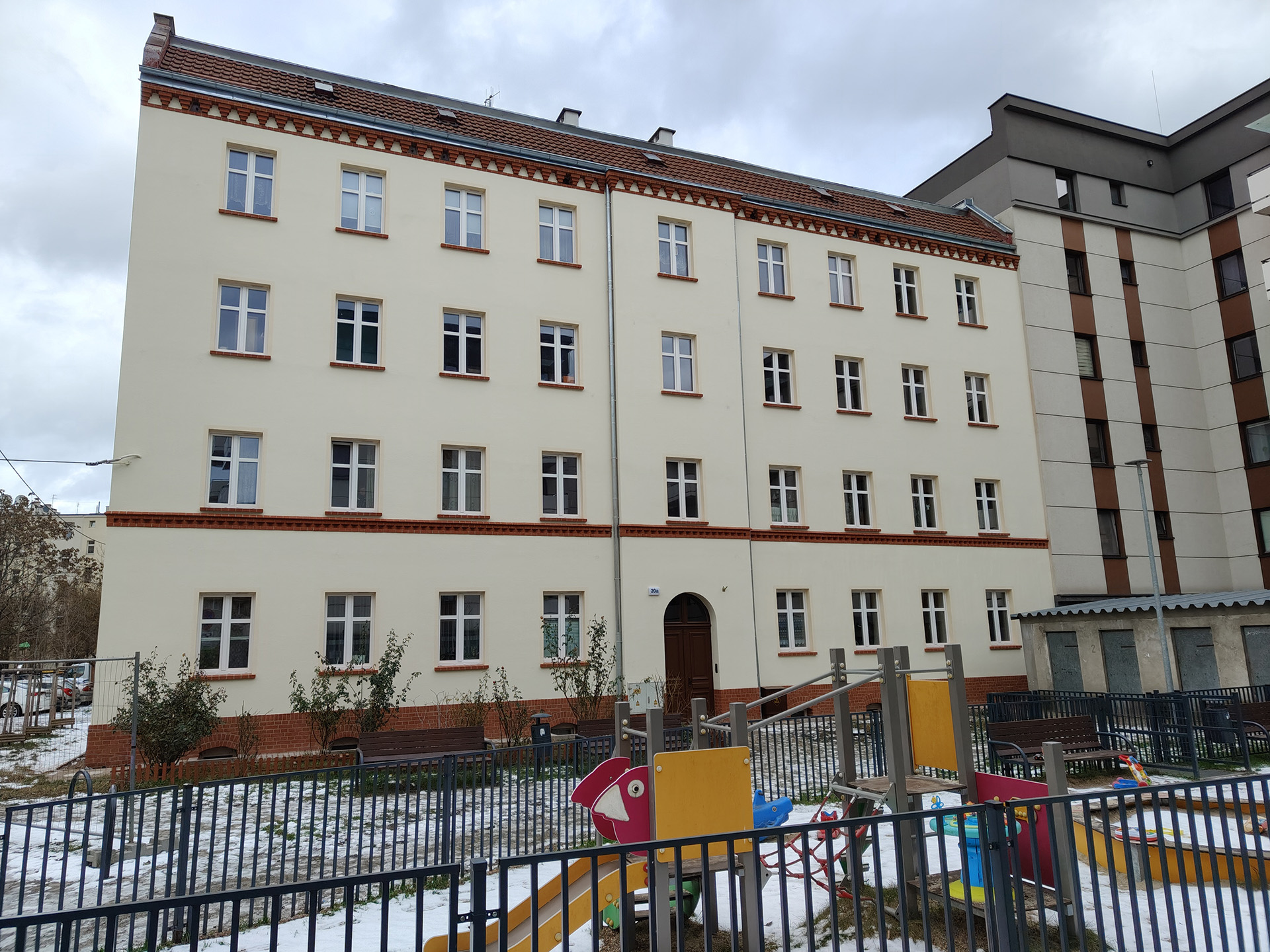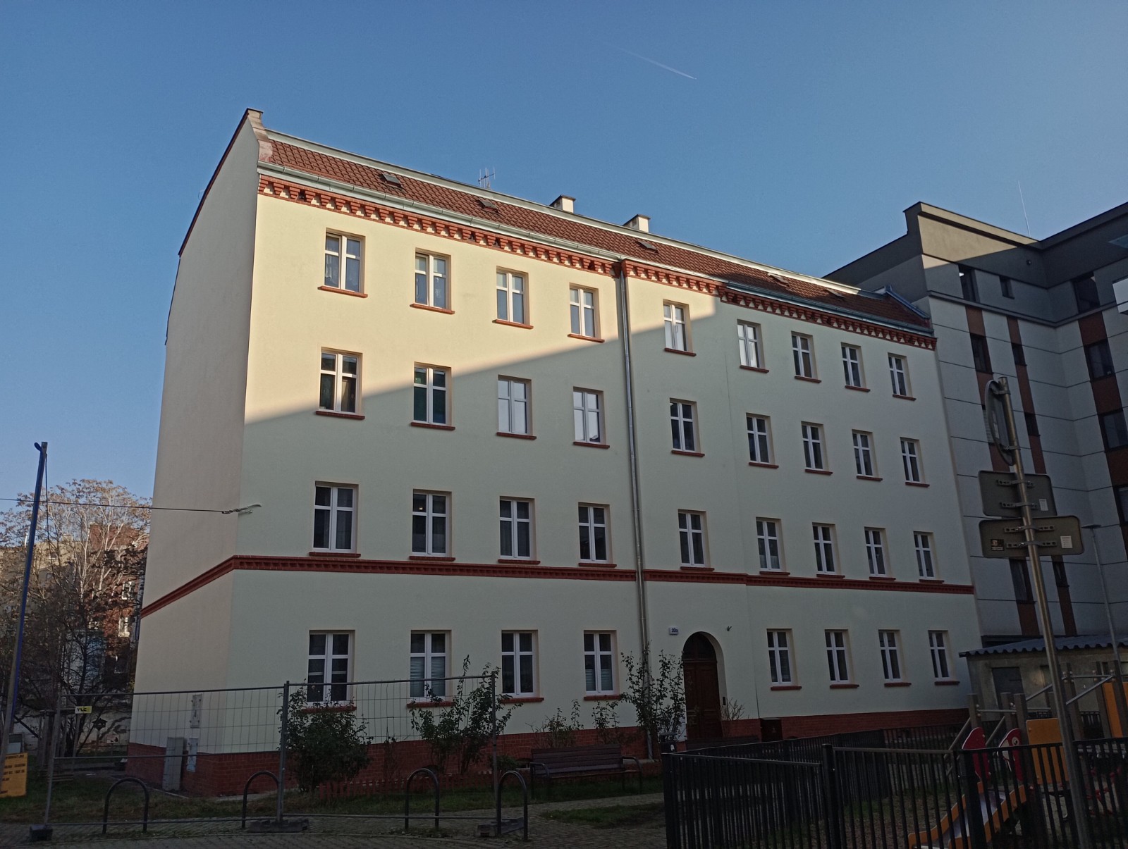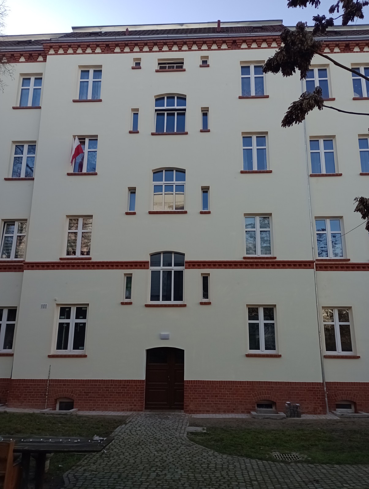 Remont z termomodernizacją w zakresie: remont dachu i strychu, ocieplenie ścian klatki schodowej od strony strychu, ocieplenie dachu nad klatką schodową, wymianę obróbek blacharskich, wymianę rynien i rur spustowych remont elewacji frontowej, tylnej i bocznej, wymianę stolarki okiennej na drewnianą na elewacji frontowej i PCV na tylnej, wraz z parapetami i podokiennikami z zachowaniem historycznych podziałów, renowację stolarki drzwiowej, wymianę obróbek blacharskich, wymianę rur spustowych, montaż zabezpieczeń przed ptakami.