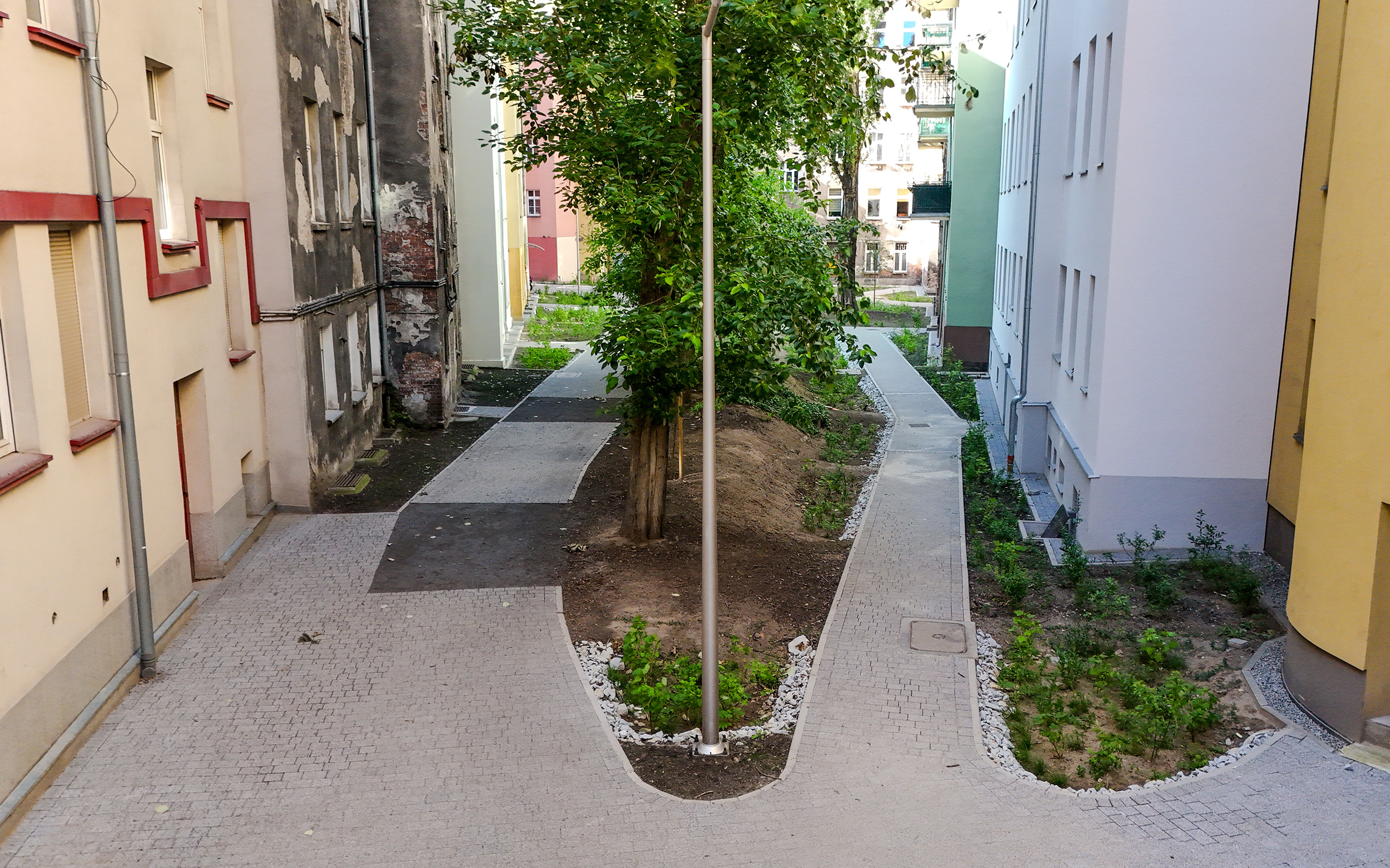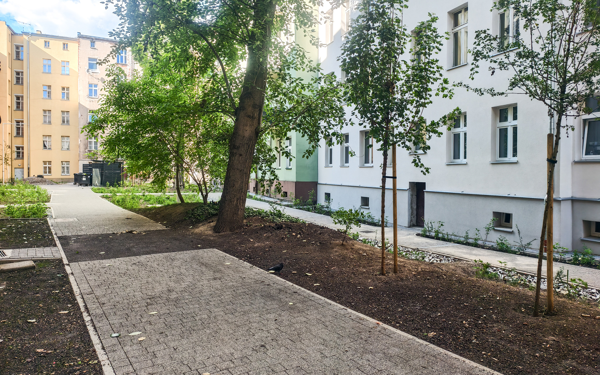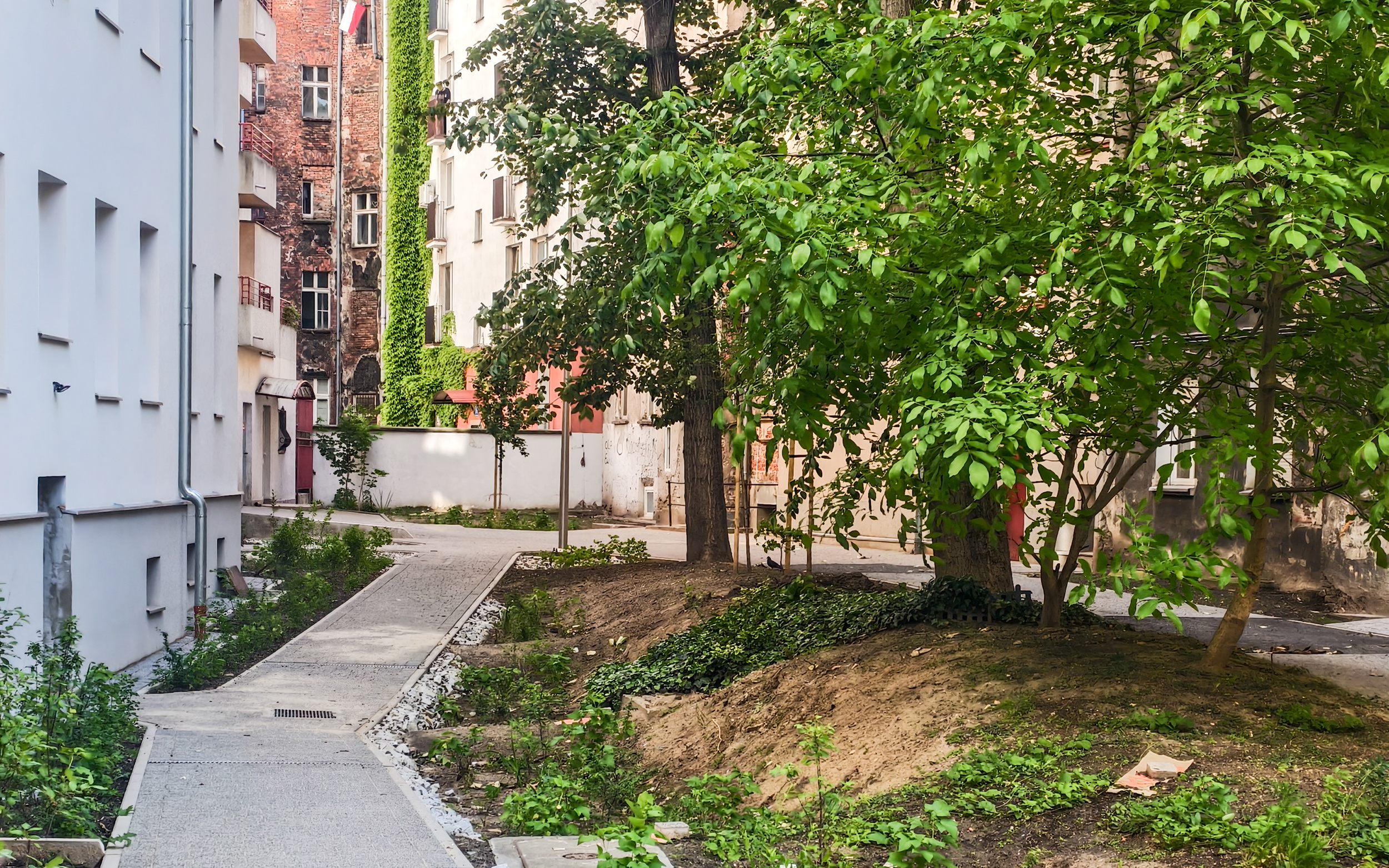 Realizacja w trybie zaprojektuj i wybuduj. Projekt obejmuje utworzenie ciągów pieszo jezdnych z nawierzchnie mineralnych, oczyszczenie i uporządkowanie terenu, rekultywację trawników, oświetlenie, utwardzenie nawierzchni pod mzo + trejaże + obsadzenie roślinnością.
